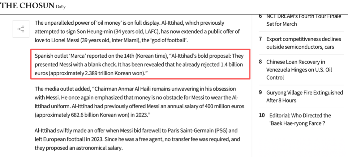 1月16日。根据《马卡报》、《OneFootball》、《朝鲜日报英文版》、《朝鲜商业英文版》等多家国际著名媒体的报道,沙特联赛豪门吉达联合俱乐部主席安马尔·海利近日在接受采访时公开他们曾在2023年用一年14亿欧元招募梅西,但被梅西拒绝了。